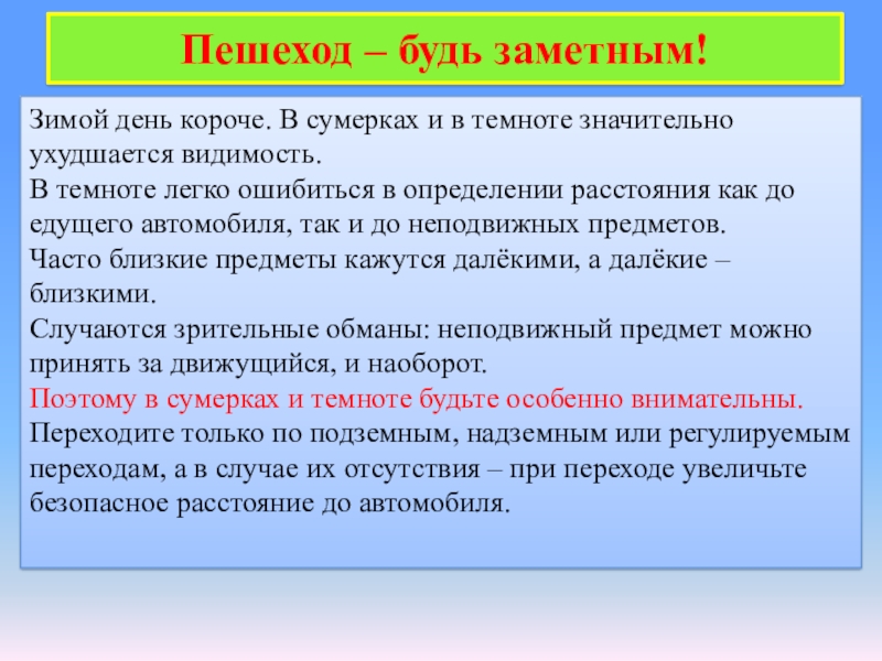 Поэтому в сумерках и темноте будьте особенно внимательны. Переходите только по пешеходным переходам.