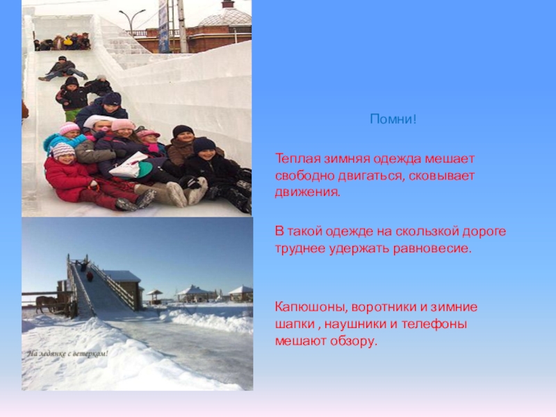 Теплая зимняя одежда мешает свободно двигаться, сковывает движения. Поскользнувшись, в такой одежде сложнее удержать равновесие. Кроме того, капюшоны, мохнатые воротники и зимние шапки также мешают обзору.