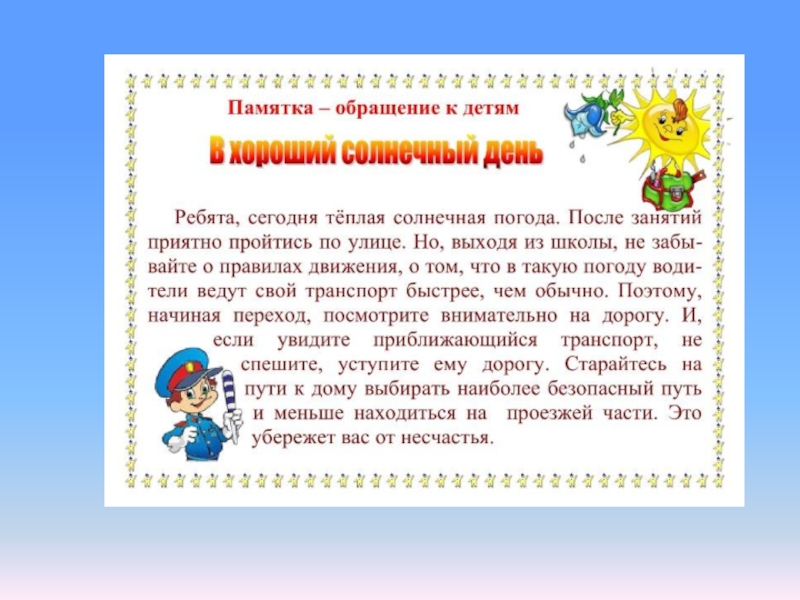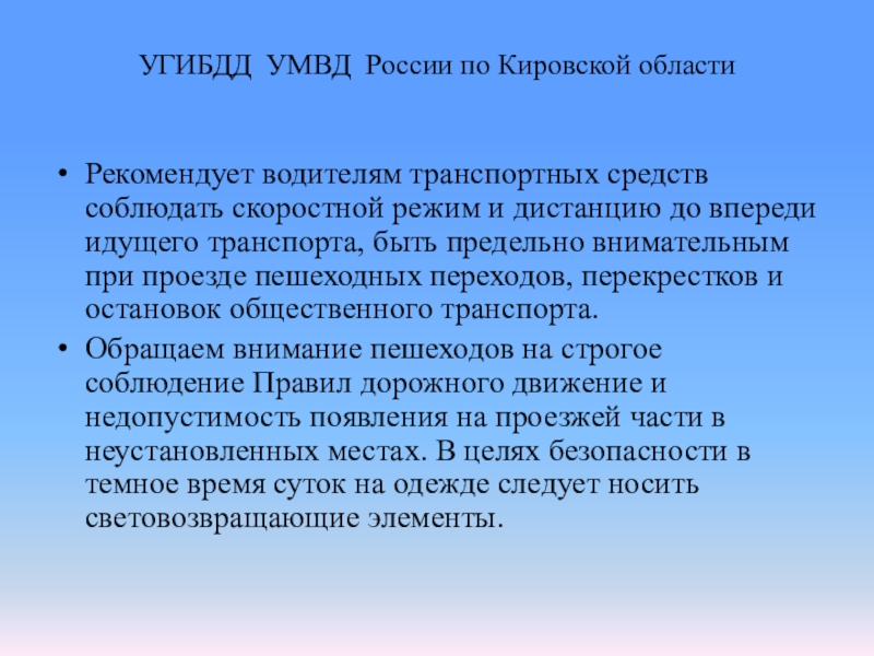 режим и дистанцию до впереди идущего транспорта, быть предельно внимательным при проезде пешеходных переходов, перекрестков и остановок общественного транспорта.
