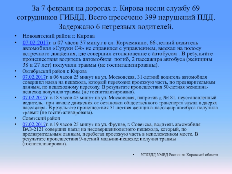 Слайд 6За 7 февраля на дорогах г. Кирова несли службу 69 сотрудников
