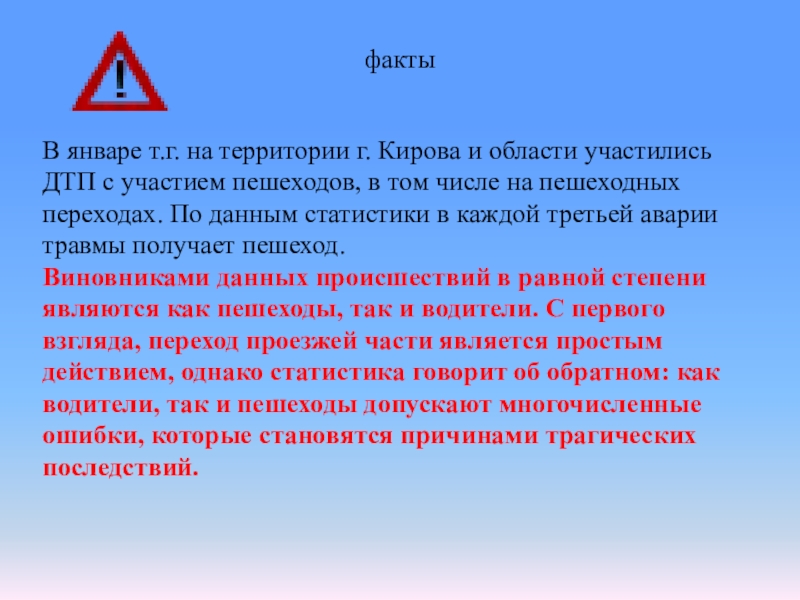 с участием пешеходов, в том числе на пешеходных переходах. По данным статистики в каждой третьей аварии травмы получает пешеход.