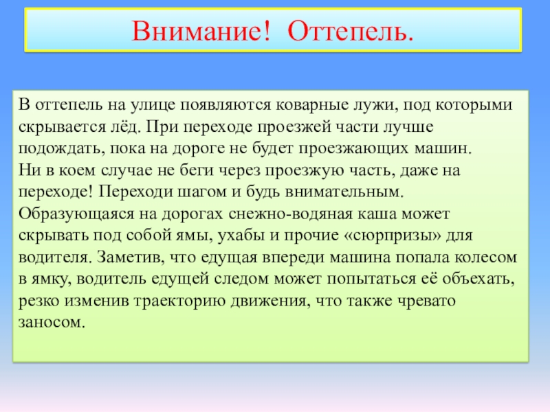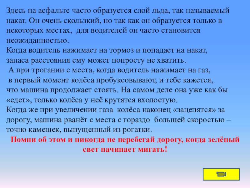 Раскатанные ледяные дорожки на тротуаре или на пешеходных переходах могут привести к серьёзным травмам!