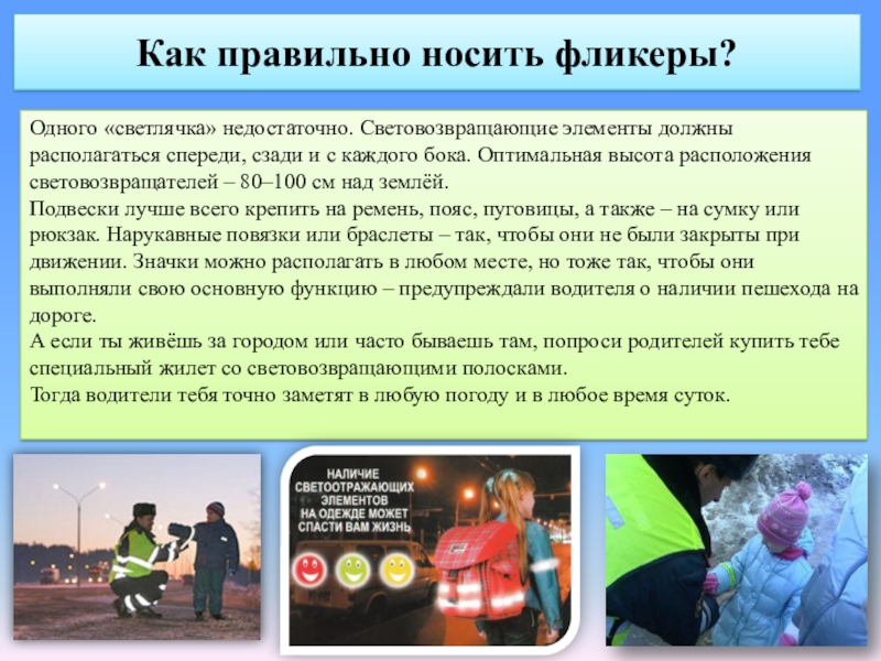 Обращаем внимание пешеходов на строгое соблюдение Правил дорожного движение и недопустимость появления на проезжей части в неустановленных местах. В целях безопасности в темное время суток на одежде следует носить световозвращающие элементы.