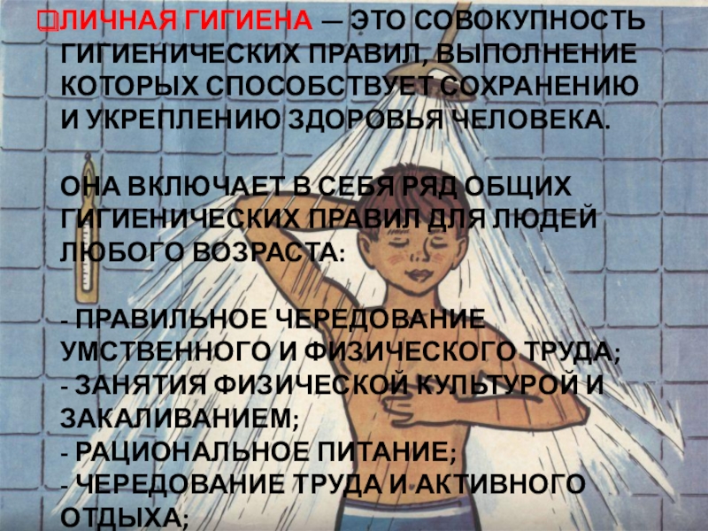Слайд 3ЛИЧНАЯ ГИГИЕНА — ЭТО СОВОКУПНОСТЬ ГИГИЕНИЧЕСКИХ ПРАВИЛ, ВЫПОЛНЕНИЕ КОТОРЫХ СПОСОБСТВУЕТ СОХРАНЕНИЮ
