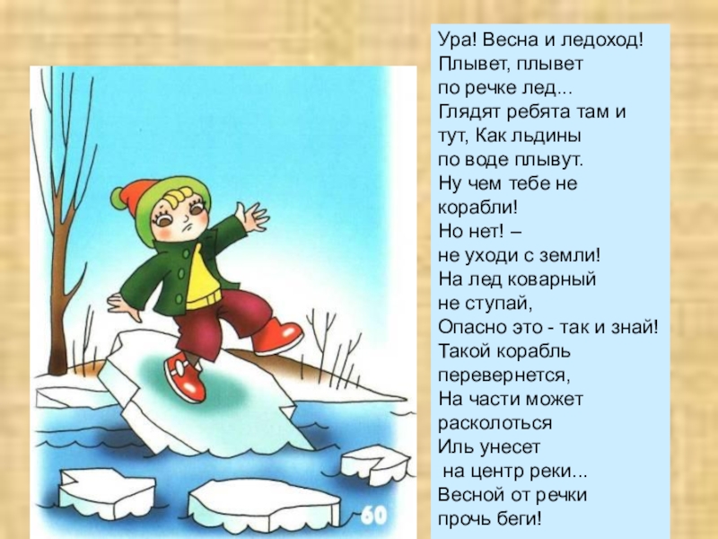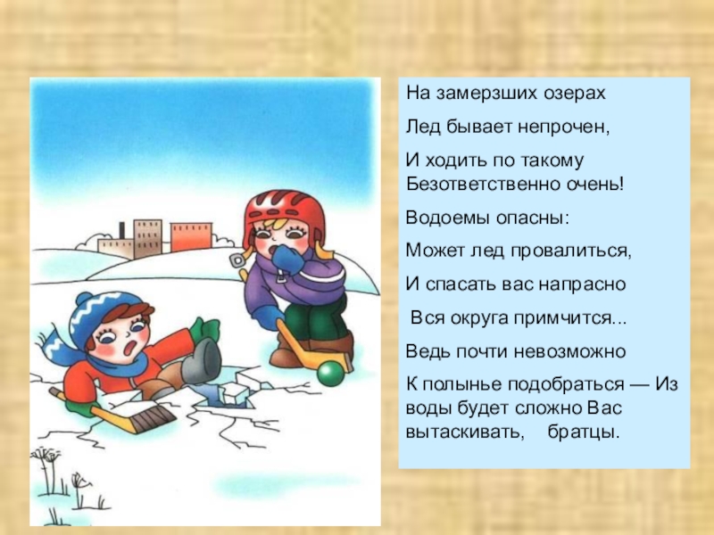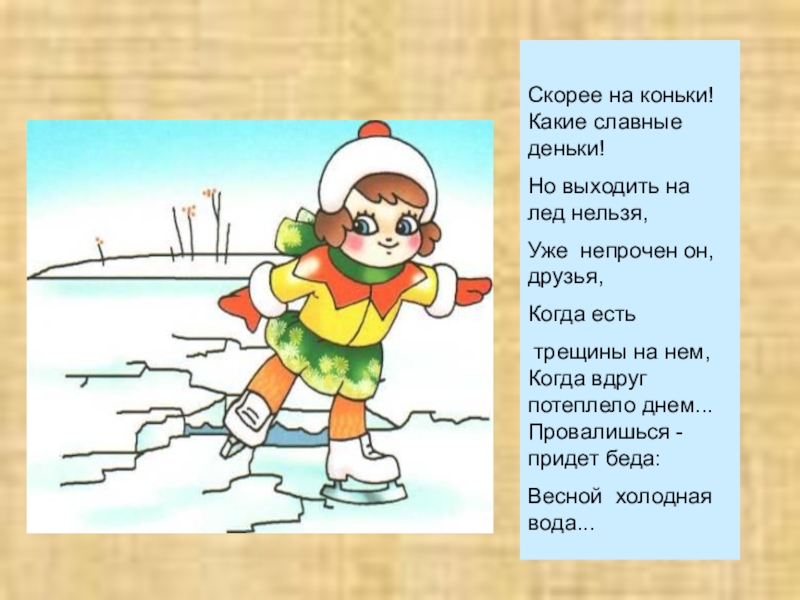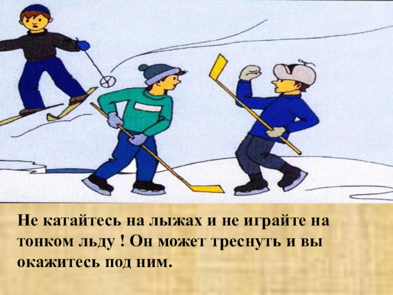 Слайд 4Не катайтесь на лыжах и не играйте на тонком льду !