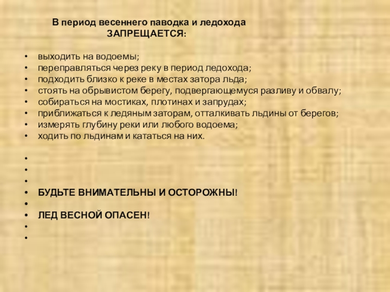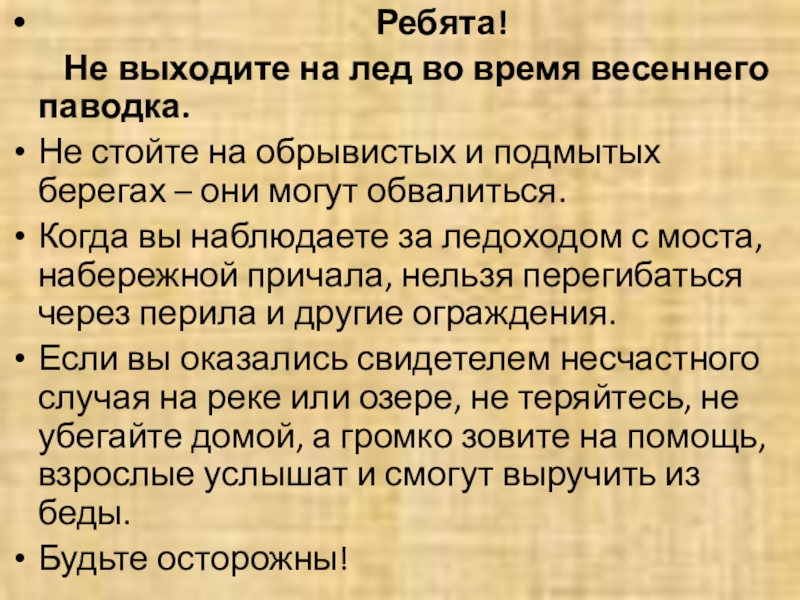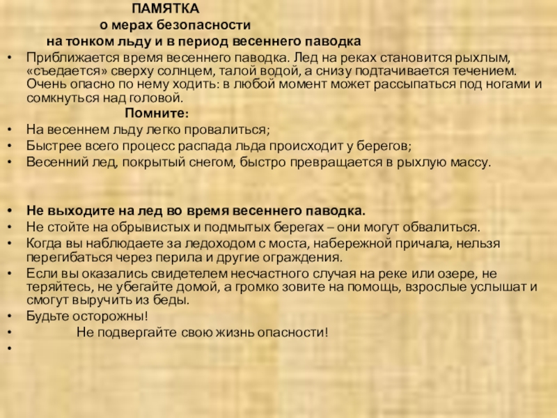 Приближается время весеннего паводка. Лед на реках становится рыхлым, «съедается» сверху солнцем, талой водой, а снизу подтачивается течением. Очень опасно по нему ходить: в любой момент может рассыпаться под ногами и сомкнуться над головой.
