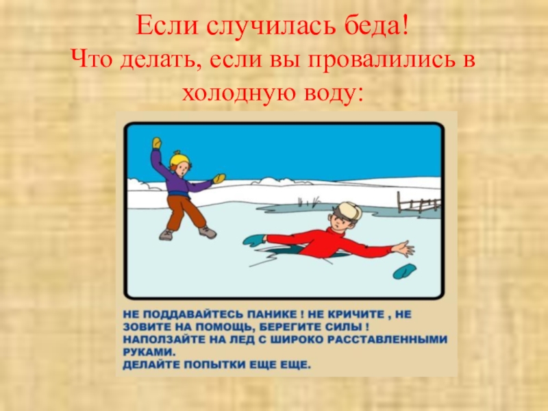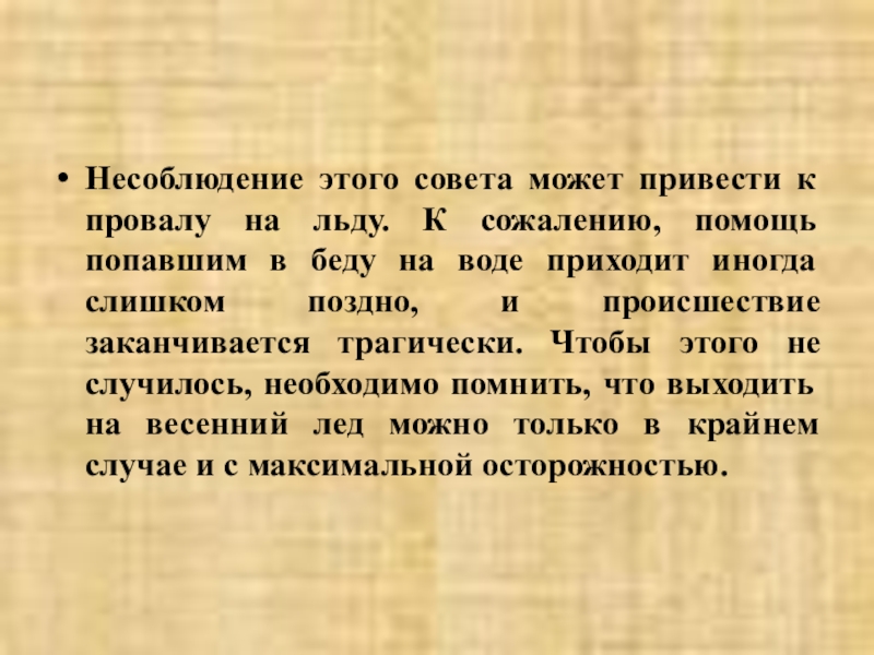 Слайд 18Несоблюдение этого совета может привести к провалу на льду. К сожалению,