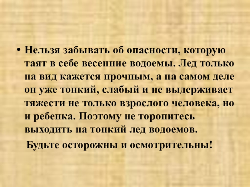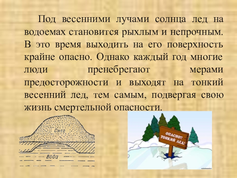 и непрочным. В это время выходить на его поверхность крайне опасно. Однако каждый год многие люди пренебрегают мерами предосторожности и выходят на тонкий весенний лед, тем самым, подвергая свою жизнь смертельной опасности.