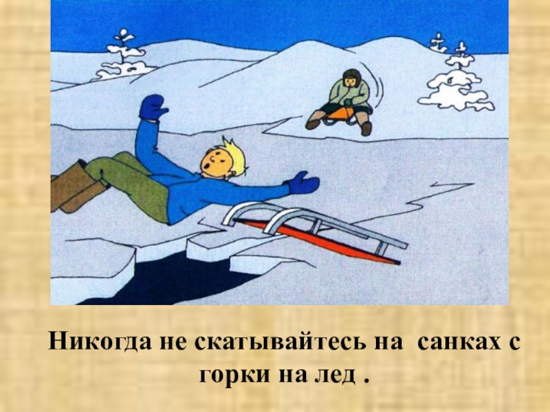 Слайд 5Никогда не скатывайтесь на санках с горки на лед .