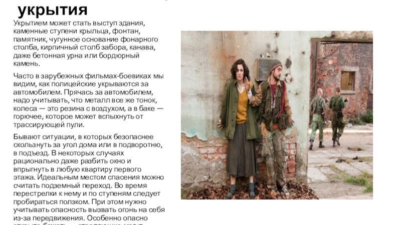 Бывают ситуации, в которых безопаснее скользнуть за угол дома или в подворотню, в подъезд. В некоторых случаях рационально даже разбить окно и впрыгнуть в любую квартиру первого этажа. Идеальным местом спасения можно считать подземный переход. Во время перестрелки к нему и по ступеням следует пробираться ползком. При этом нужно учитывать опасность вызвать огонь на себя из-за передвижения. Особенно опасно открыто бежать — стреляющие могут принять вас за противника.