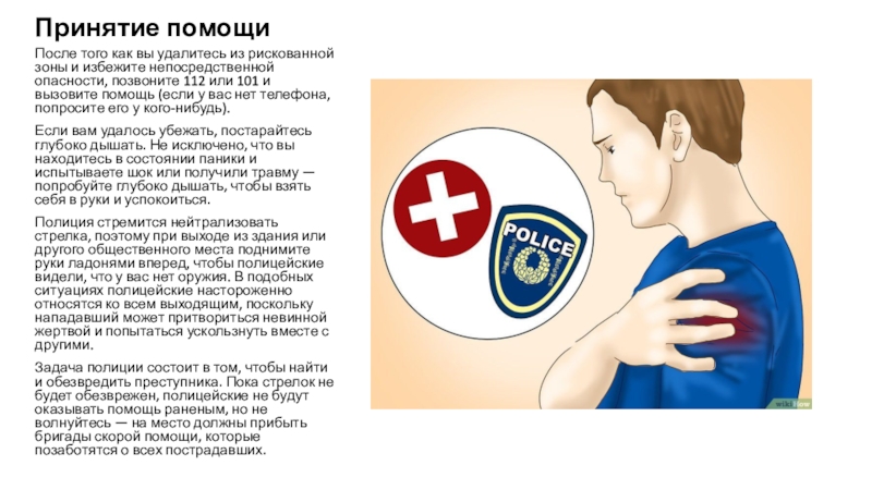 Полиция стремится нейтрализовать стрелка, поэтому при выходе из здания или другого общественного места поднимите руки ладонями вперед, чтобы полицейские видели, что у вас нет оружия. В подобных ситуациях полицейские настороженно относятся ко всем выходящим, поскольку нападавший может притвориться невинной жертвой и попытаться ускользнуть вместе с другими.