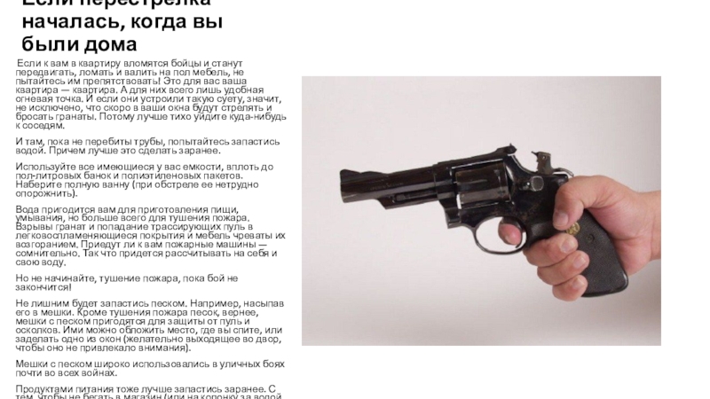 квартиру вломятся бойцы и станут передвигать, ломать и валить на пол мебель, не пытайтесь им препятствовать! Это для вас ваша квартира — квартира. А для них всего лишь удобная огневая точка. И если они устроили такую суету, значит, не исключено, что скоро в ваши окна будут стрелять и бросать гранаты. Потому лучше тихо уйдите куда-нибудь к соседям.