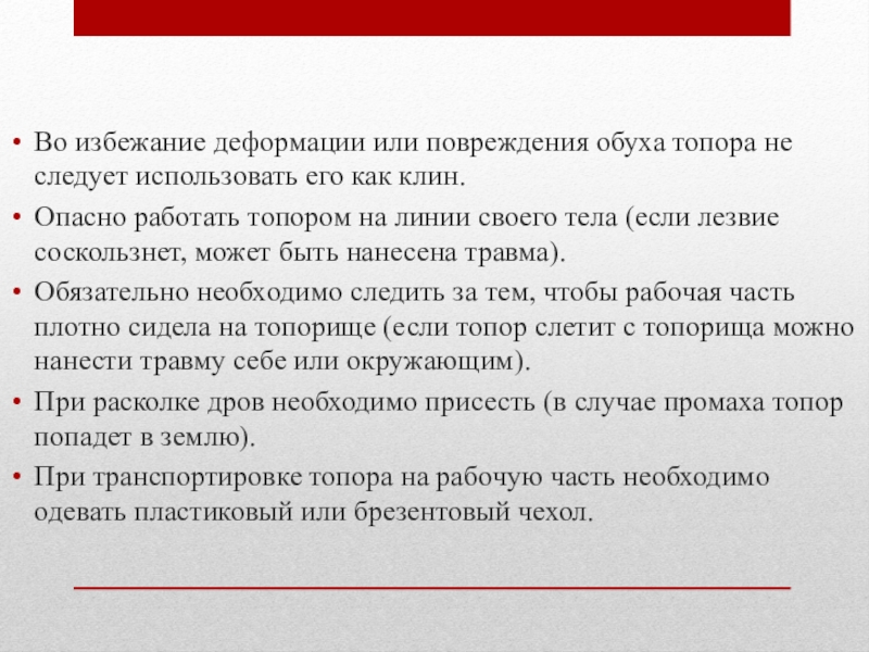 Обязательно необходимо следить за тем, чтобы рабочая часть плотно сидела на топорище (если топор слетит с топорища можно нанести травму себе или окружающим).