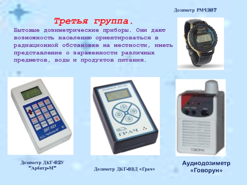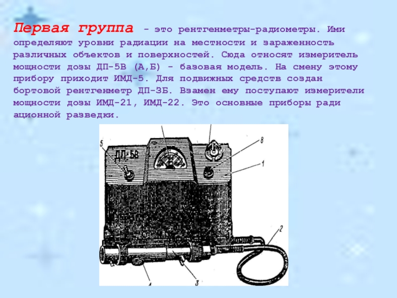 Слайд 16Первая группа - это рентгенметры-радиометры. Ими определяют уровни радиации на местности