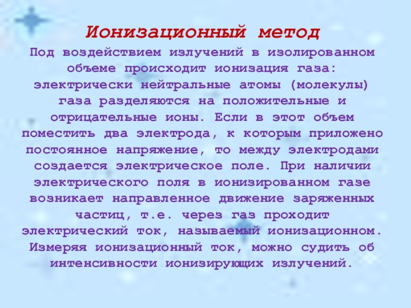 электрически нейтральные атомы (молекулы) газа разделяются на положительные и отрицательные ионы. Если в этот объем поместить два электрода, к которым приложено постоянное напряжение, то между электродами создается электрическое поле. При наличии электрического поля в ионизированном газе возникает направленное движение заряженных частиц, т.е. через газ проходит электрический ток, называемый ионизационном. Измеряя ионизационный ток, можно судить об интенсивности ионизирующих излучений.