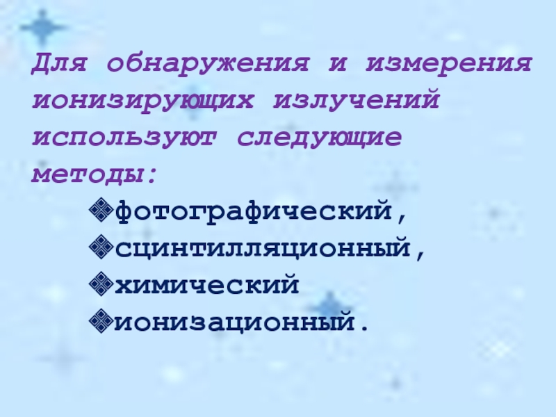 Слайд 7Для обнаружения и измерения ионизирующих излучений используют следующие методы: