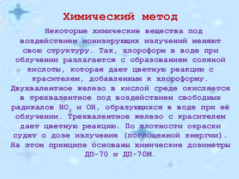 структуру. Так, хлороформ в воде при облучении разлагается с образованием соляной кислоты, которая дает цветную реакцию с красителем, добавленным к хлороформу. Двухвалентное железо в кислой среде окисляется в трехвалентное под воздействием свободных радикалов HO2 и ОН, образующихся в воде при её облучении. Трехвалентное железо с красителем дает цветную реакцию. По плотности окраски судят о дозе излучения (поглощенной энергии). На этом принципе основаны химические дозиметры ДП-70 и ДП-70М.