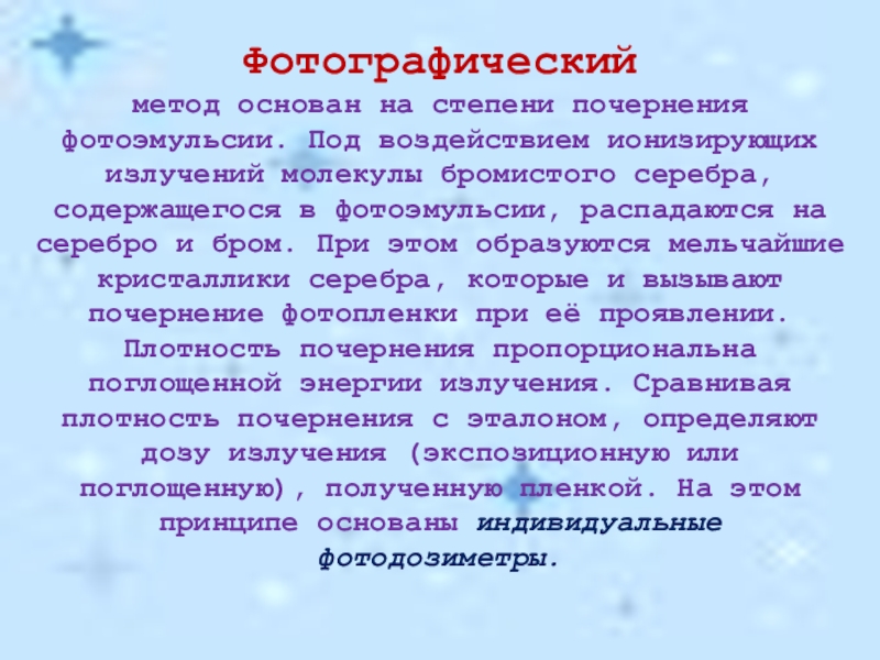 метод основан на степени почернения фотоэмульсии. Под воздействием ионизирующих излучений