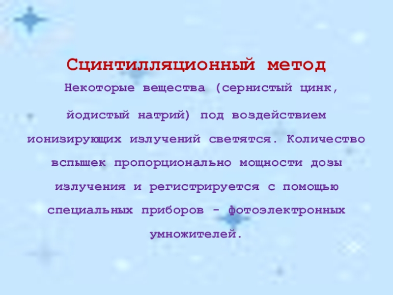 излучений светятся. Количество вспышек пропорционально мощности дозы излучения и регистрируется с помощью специальных приборов - фотоэлектронных умножителей.