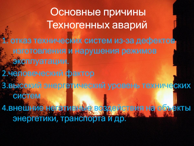 Основные причины  Техногенных аварий1. отказ технических систем из-за дефектов изготовления и нарушения режимов эксплуатации.2.человеческий фактор3.высокий энергетический уровень