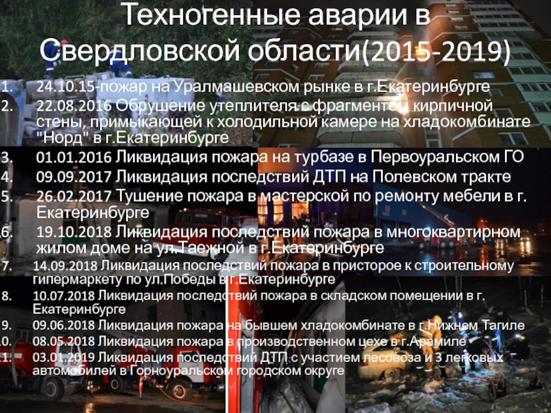Техногенные аварии в Свердловской области(2015-2019)24.10.15-пожар на Уралмашевском рынке в г.Екатеринбурге22.08.2016 Обрушение утеплителя с фрагментом кирпичной стены, примыкающей