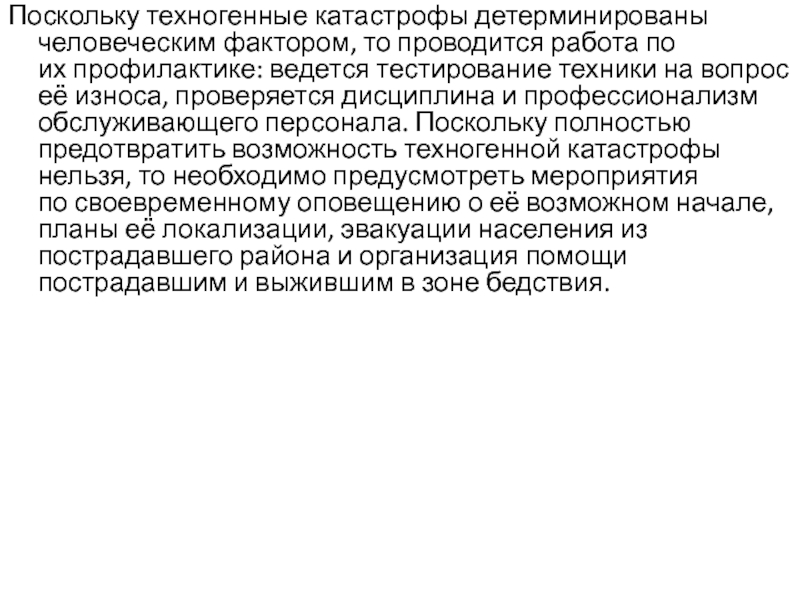Слайд 7Поскольку техногенные катастрофы детерминированы человеческим фактором, то проводится работа по их профилактике: