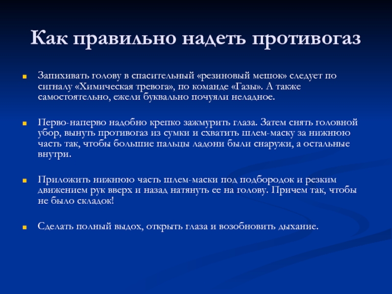 Как правильно надеть противогазЗапихивать голову в спасительный «резиновый мешок» следует по сигналу «Химическая тревога», по команде «Газы».