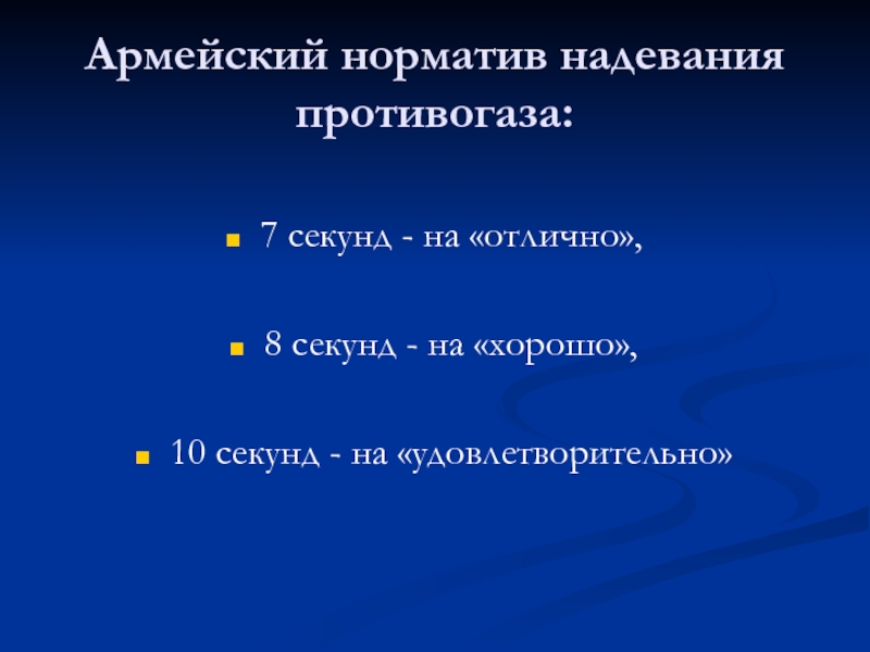 Армейский норматив надевания противогаза:7 секунд - на «отлично»,8 секунд - на «хорошо»,10 секунд - на «удовлетворительно»