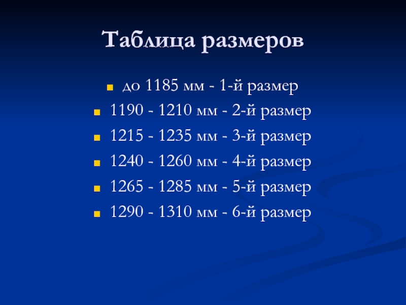 Таблица размеровдо 1185 мм - 1-й размер1190 - 1210 мм - 2-й размер1215 - 1235 мм -