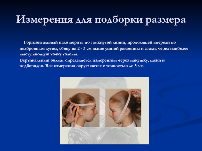 Измерения для подборки размера   Горизонтальный надо мерить по замкнутой линии, проходящей впереди по надбровным дугам,