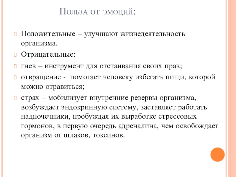 страх – мобилизует внутренние резервы организма, возбуждает эндокринную систему, заставляет работать надпочечники, пробуждая их выработке стрессовых гормонов, в первую очередь адреналина, чем освобождает организм от шлаков, токсинов.