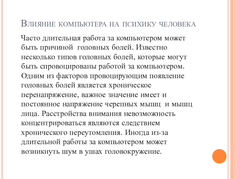 может быть причиной головных болей. Известно несколько типов головных болей, которые могут быть спровоцированы работой за компьютером. Одним из факторов провоцирующим появление головных болей является хроническое перенапряжение, важное значение имеет и постоянное напряжение черепных мышц и мышц лица. Расстройства внимания невозможность концентрироваться являются следствием хронического переутомления. Иногда из-за длительной работы за компьютером может возникнуть шум в ушах головокружение.