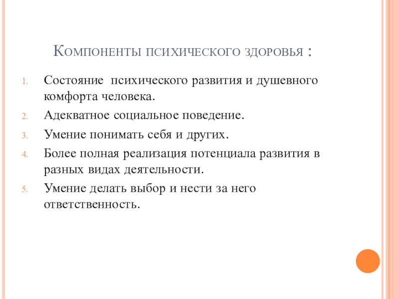 при котором человек способен реализовать свой собственный потенциал, справляться с обычными жизненными стрессами, продуктивно и плодотворно работать, а также вносить вклад в жизнь своего общества.