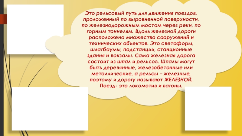 железнодорожным мостам через реки, по горным тоннелям. Вдоль железной дороги расположено множество сооружений и технических объектов. Это светофоры, шлагбаумы, подстанции, станционные здания и вокзалы. Сама железная дорога состоит из шпал и рельсов. Шпалы могут быть деревянные, железобетонные или металлические, а рельсы – железные, поэтому и дорогу называют ЖЕЛЕЗНОЙ. Поезд- это локомотив и вагоны.