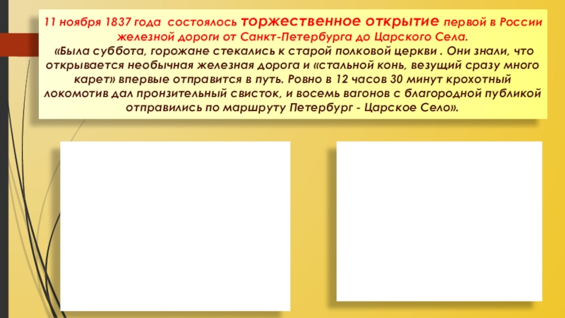 дороги от Санкт-Петербурга до Царского Села. «Была суббота, горожане стекались к старой полковой церкви . Они знали, что открывается необычная железная дорога и «стальной конь, везущий сразу много карет» впервые отправится в путь. Ровно в 12 часов 30 минут крохотный локомотив дал пронзительный свисток, и восемь вагонов с благородной публикой отправились по маршруту Петербург - Царское Село».