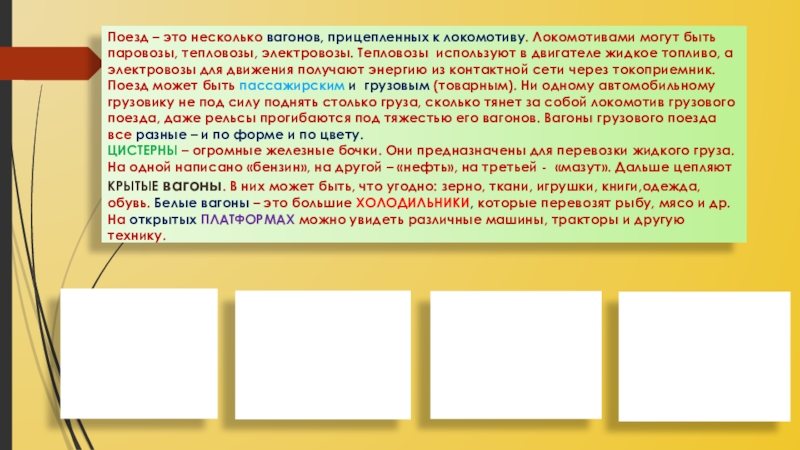 паровозы, тепловозы, электровозы. Тепловозы используют в двигателе жидкое топливо, а электровозы для движения получают энергию из контактной сети через токоприемник. Поезд может быть пассажирским и грузовым (товарным). Ни одному автомобильному грузовику не под силу поднять столько груза, сколько тянет за собой локомотив грузового поезда, даже рельсы прогибаются под тяжестью его вагонов. Вагоны грузового поезда все разные – и по форме и по цвету. ЦИСТЕРНЫ – огромные железные бочки. Они предназначены для перевозки жидкого груза. На одной написано «бензин», на другой – «нефть», на третьей - «мазут». Дальше цепляют КРЫТЫЕ вагоны. В них может быть, что угодно: зерно, ткани, игрушки, книги,одежда, обувь. Белые вагоны – это большие ХОЛОДИЛЬНИКИ, которые перевозят рыбу, мясо и др. На открытых ПЛАТФОРМАХ можно увидеть различные машины, тракторы и другую технику.