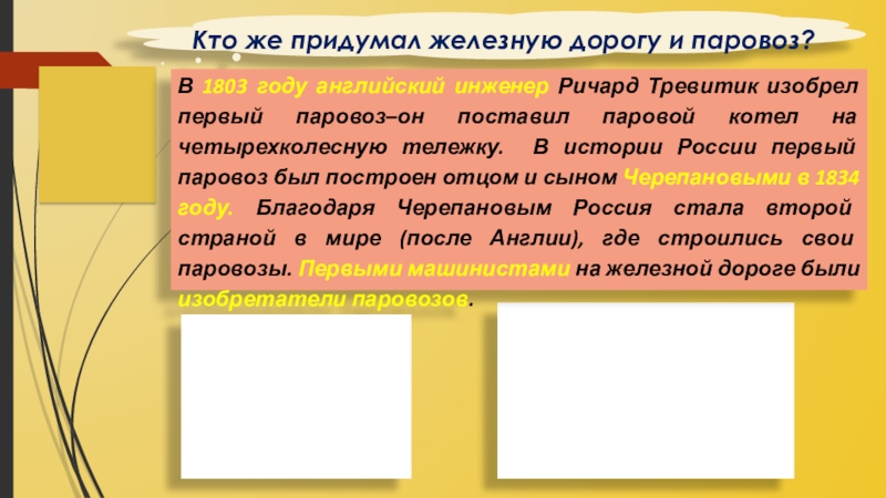 Ричард Тревитик изобрел первый паровоз–он поставил паровой котел на четырехколесную тележку. В истории России первый паровоз был построен отцом и сыном Черепановыми в 1834 году. Благодаря Черепановым Россия стала второй страной в мире (после Англии), где строились свои паровозы. Первыми машинистами на железной дороге были изобретатели паровозов.