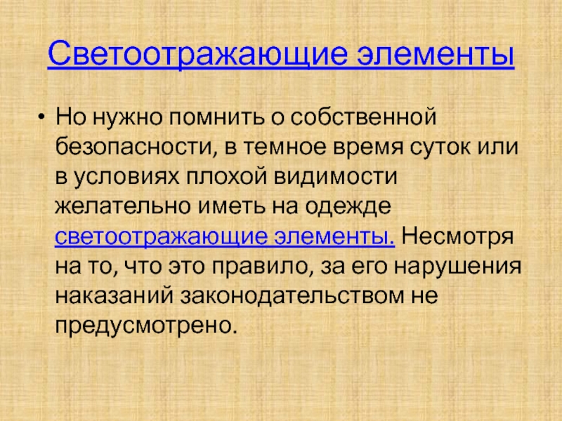 или в условиях плохой видимости желательно иметь на одежде светоотражающие элементы. Несмотря на то, что это правило, за его нарушения наказаний законодательством не предусмотрено.