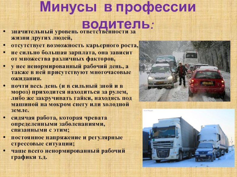 почти весь день (и в сильный зной и в мороз) приходится находиться за рулем, либо же закручивать гайки, находясь под машиной на мокром снегу или холодной земле.
