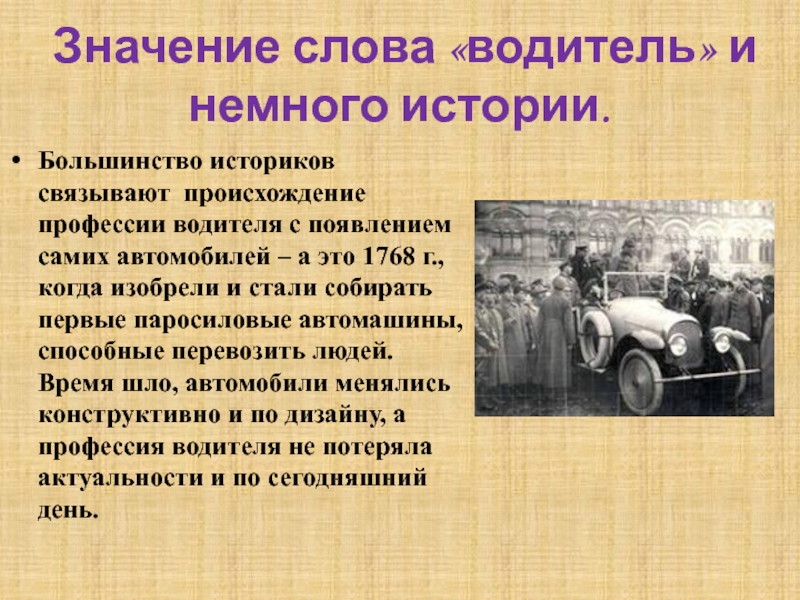 с появлением самих автомобилей – а это 1768 г., когда изобрели и стали собирать первые паросиловые автомашины, способные перевозить людей. Время шло, автомобили менялись конструктивно и по дизайну, а профессия водителя не потеряла актуальности и по сегодняшний день.