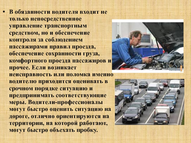 и обеспечение контроля за соблюдением пассажирами правил проезда, обеспечение сохранности груза, комфортного проезда пассажиров и прочее. Если возникает неисправность или поломка именно водителю приходится оценивать в срочном порядке ситуацию и предпринимать соответствующие меры. Водители-профессионалы могут быстро оценить ситуацию на дороге, отлично ориентируются на территории, на которой работают, могут быстро объехать пробку.