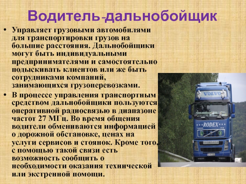 Управляет грузовыми автомобилями для транспортировки грузов на большие расстояния. Дальнобойщики могут