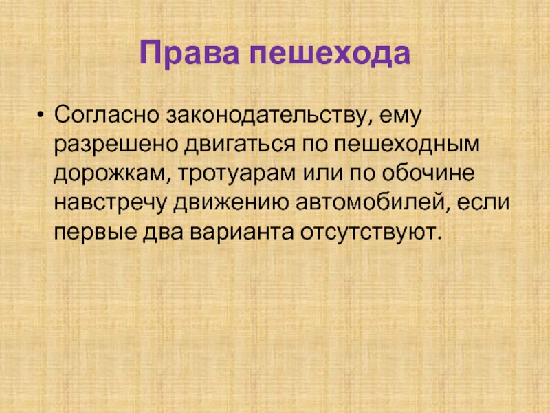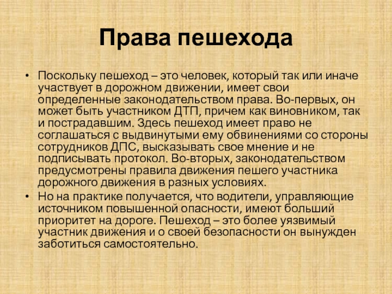 в дорожном движении, имеет свои определенные законодательством права. Во-первых, он может быть участником ДТП, причем как виновником, так и пострадавшим. Здесь пешеход имеет право не соглашаться с выдвинутыми ему обвинениями со стороны сотрудников ДПС, высказывать свое мнение и не подписывать протокол. Во-вторых, законодательством предусмотрены правила движения пешего участника дорожного движения в разных условиях.