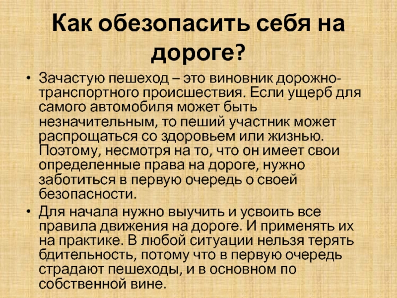 Для начала нужно выучить и усвоить все правила движения на дороге. И применять их на практике. В любой ситуации нельзя терять бдительность, потому что в первую очередь страдают пешеходы, и в основном по собственной вине.