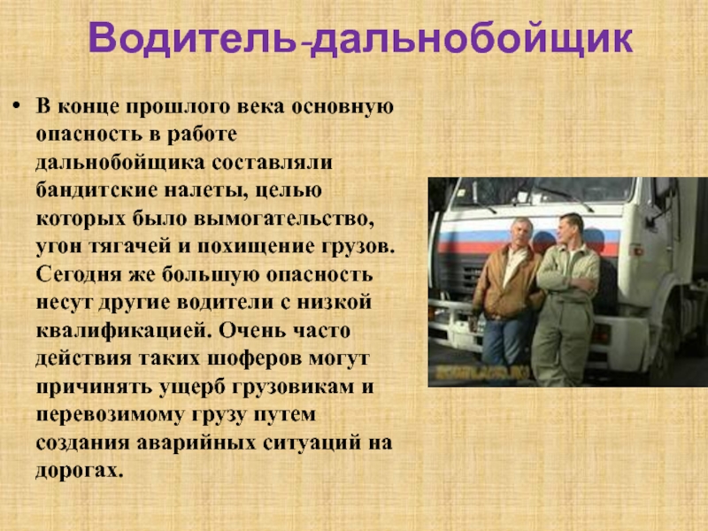 налеты, целью которых было вымогательство, угон тягачей и похищение грузов. Сегодня же большую опасность несут другие водители с низкой квалификацией. Очень часто действия таких шоферов могут причинять ущерб грузовикам и перевозимому грузу путем создания аварийных ситуаций на дорогах.