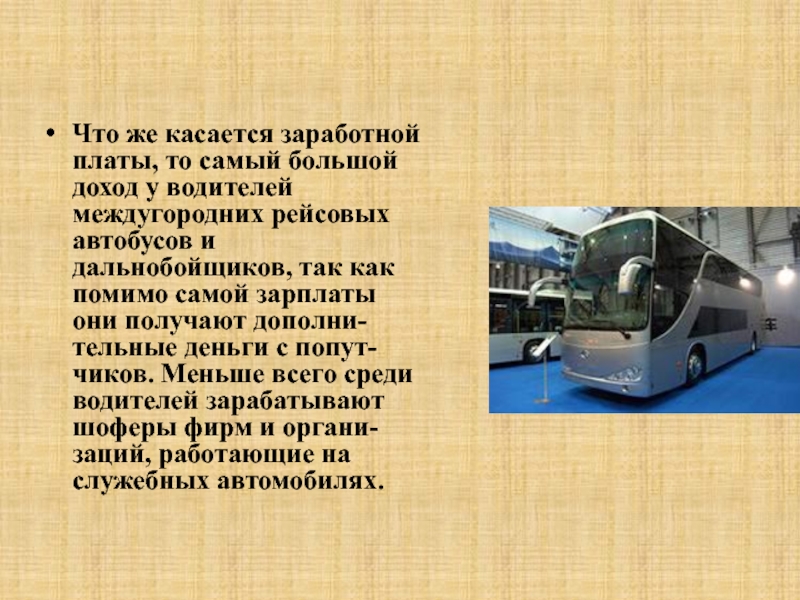 междугородних рейсовых автобусов и дальнобойщиков, так как помимо самой зарплаты они получают дополни-тельные деньги с попут-чиков. Меньше всего среди водителей зарабатывают шоферы фирм и органи-заций, работающие на служебных автомобилях.