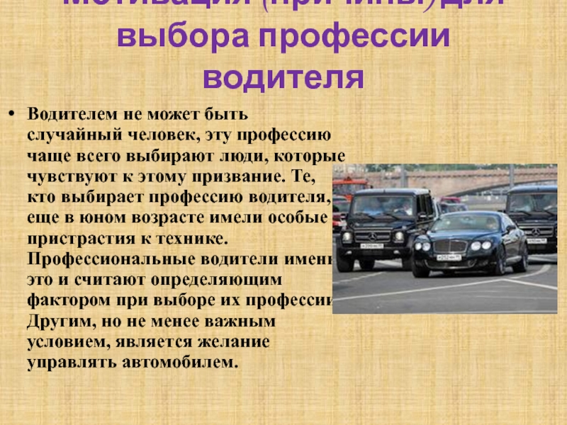 Слайд 12Мотивация (причины) для выбора профессии водителя