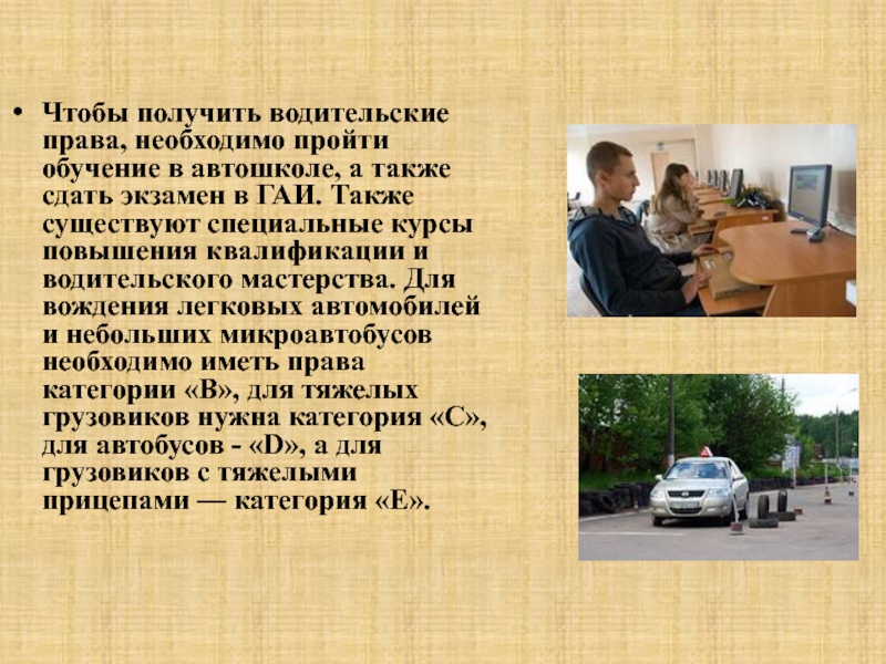 Слайд 15Чтобы получить водительские права, необходимо пройти обучение в автошколе, а также