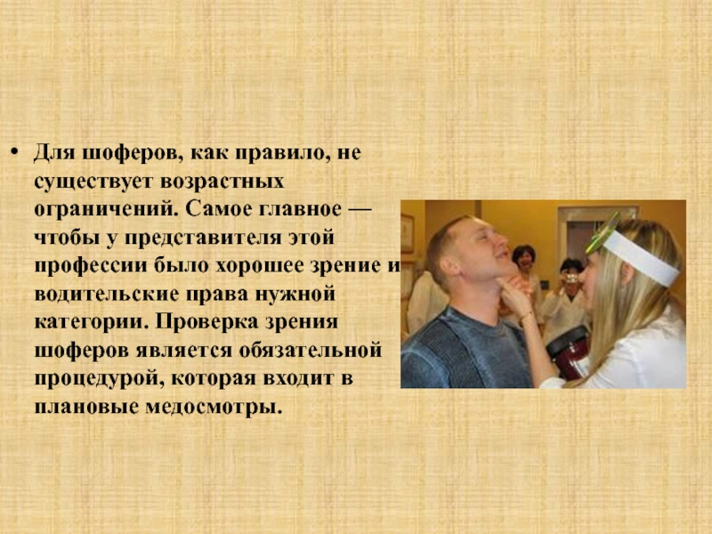 Слайд 14Для шоферов, как правило, не существует возрастных ограничений. Самое главное —