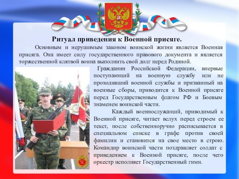 Гражданин Российской Федерации, впервые поступающий на военную службу или не проходивший военной службы и призванный на военные сборы, приводится к Военной присяге перед Государственным флагом РФ и Боевым знаменем воинской части.